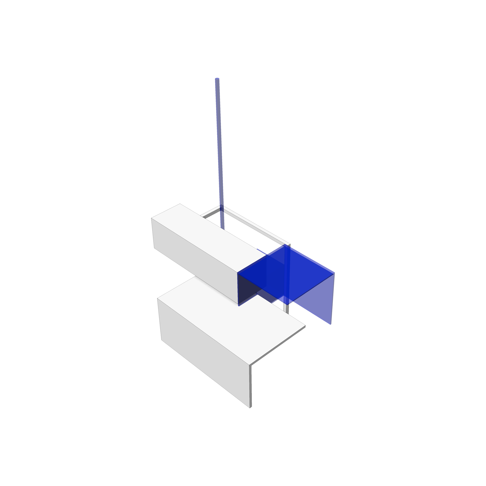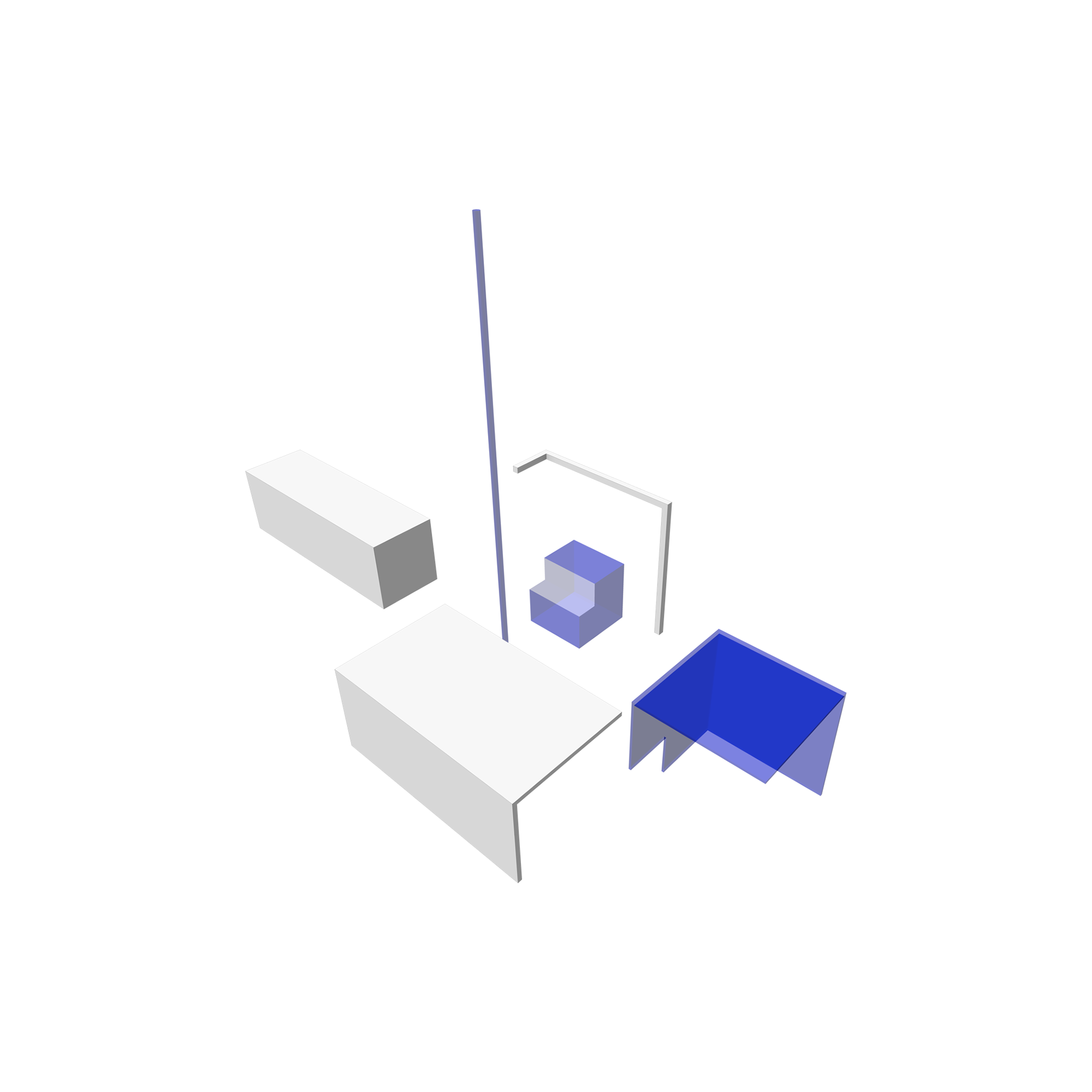 Samengevoegd creëren deze elementen een multifunctioneel meubelstuk dat geschikt is voor zowel zitten als werken. De combinatie van de geometrische vormen (kubus, plaat en cilinder) geeft het meubel een eigentijdse en gestileerde uitstraling, terwijl de blauwe kleur zorgt voor een aantrekkelijke visuele impact. Het resultaat is een functioneel en esthetisch verantwoord zit- en werkmeubel.