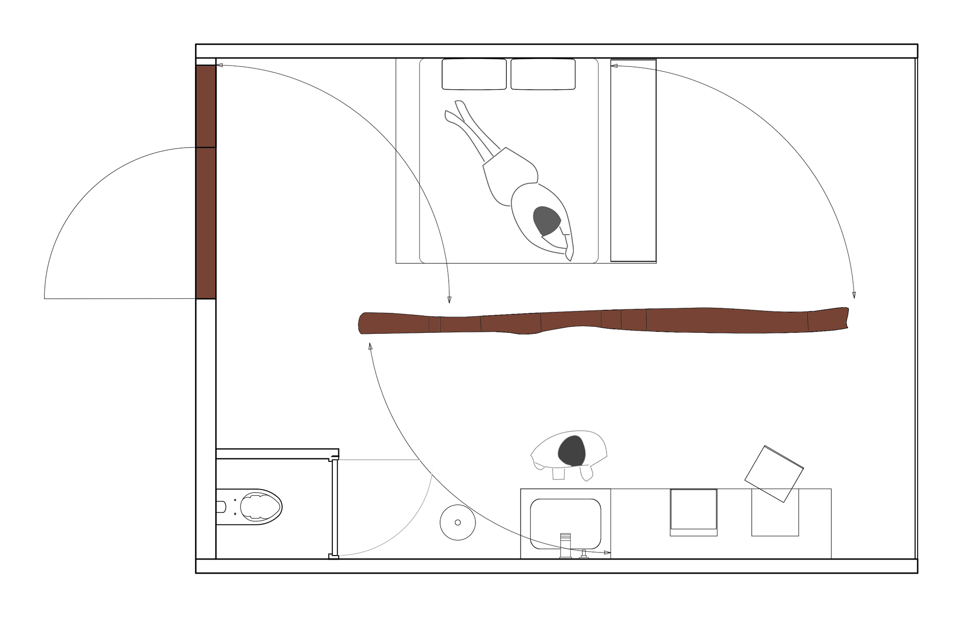 In deze hotelkamer wordt de nieuwsgierigheid verder aangewakkerd door slim verborgen details die zich achter de beweegbare wand bevinden. Terwijl je de mysterieuze elementen verkent, ontvouwt zich een betoverend spel van onthullingen, waarbij elke beweging nieuwe facetten van de ruimte onthult en je uitnodigt tot een boeiende ontdekkingsreis.