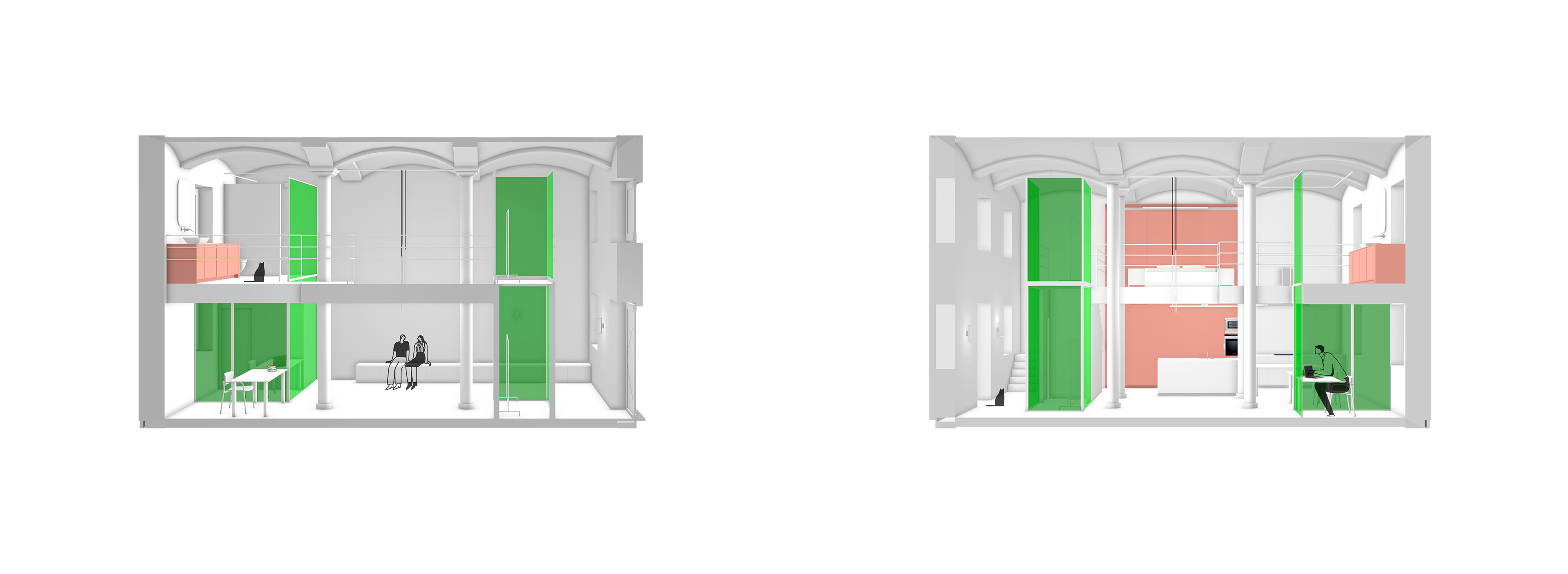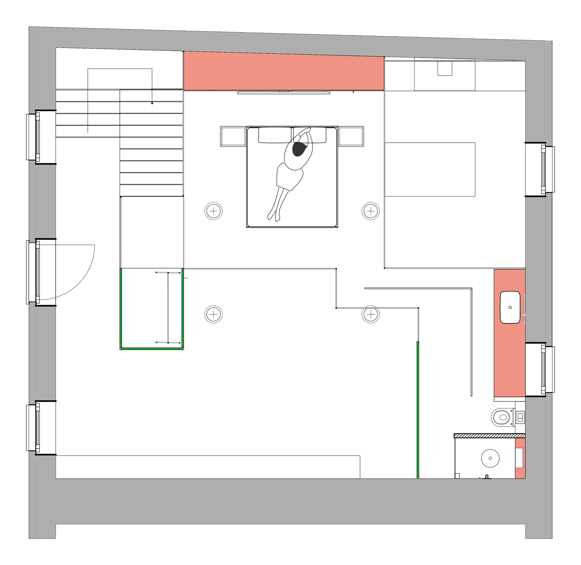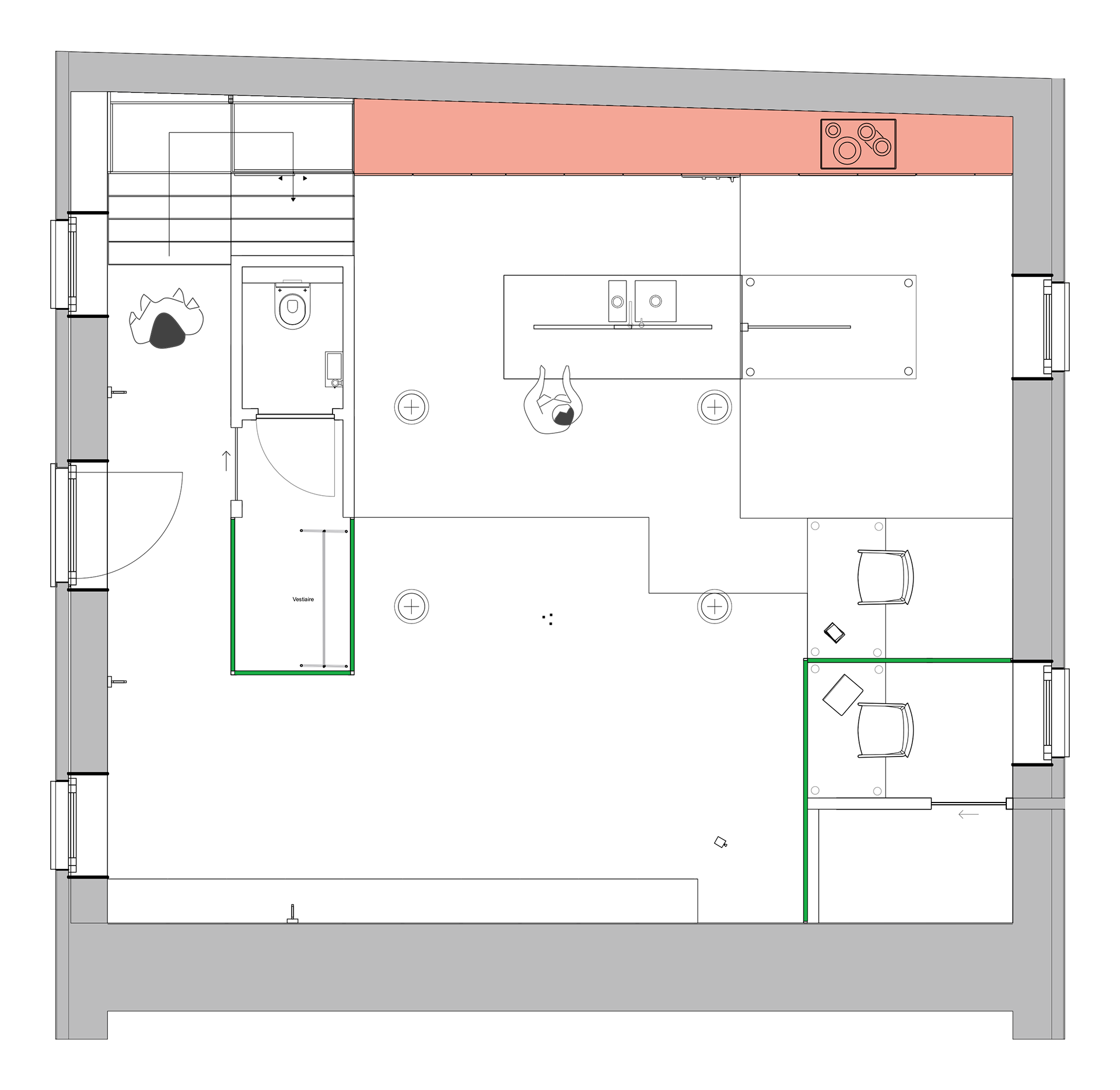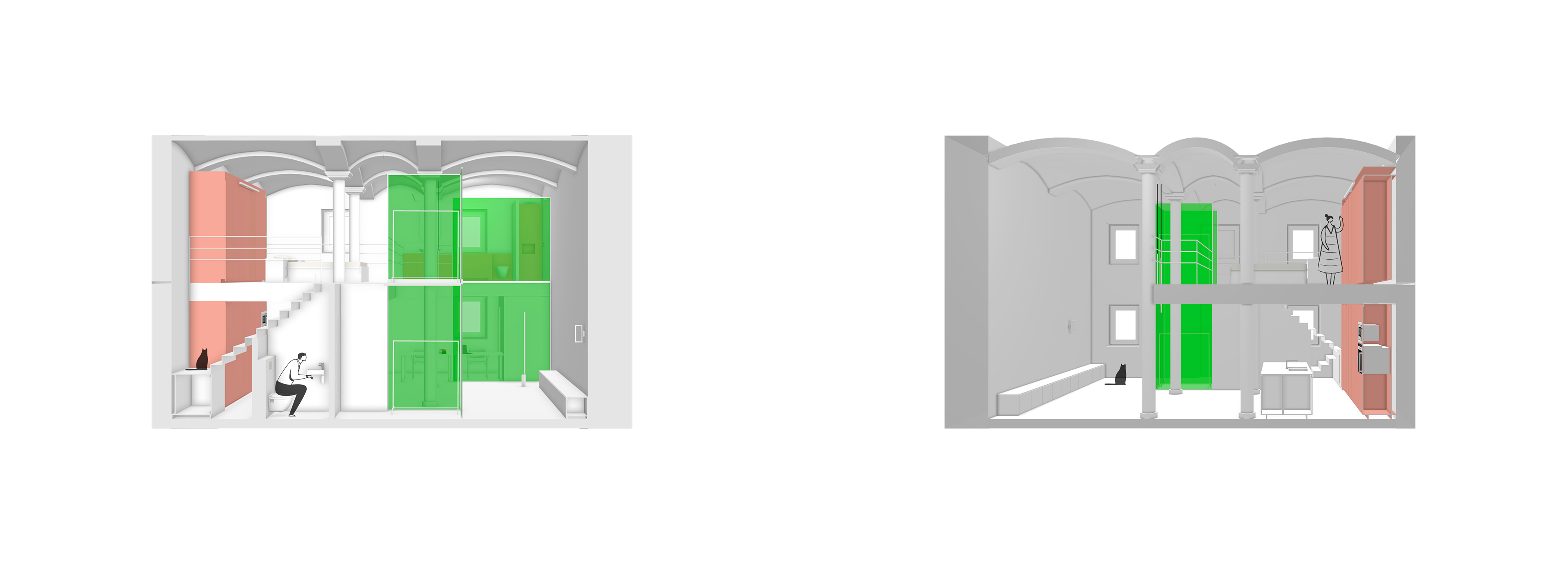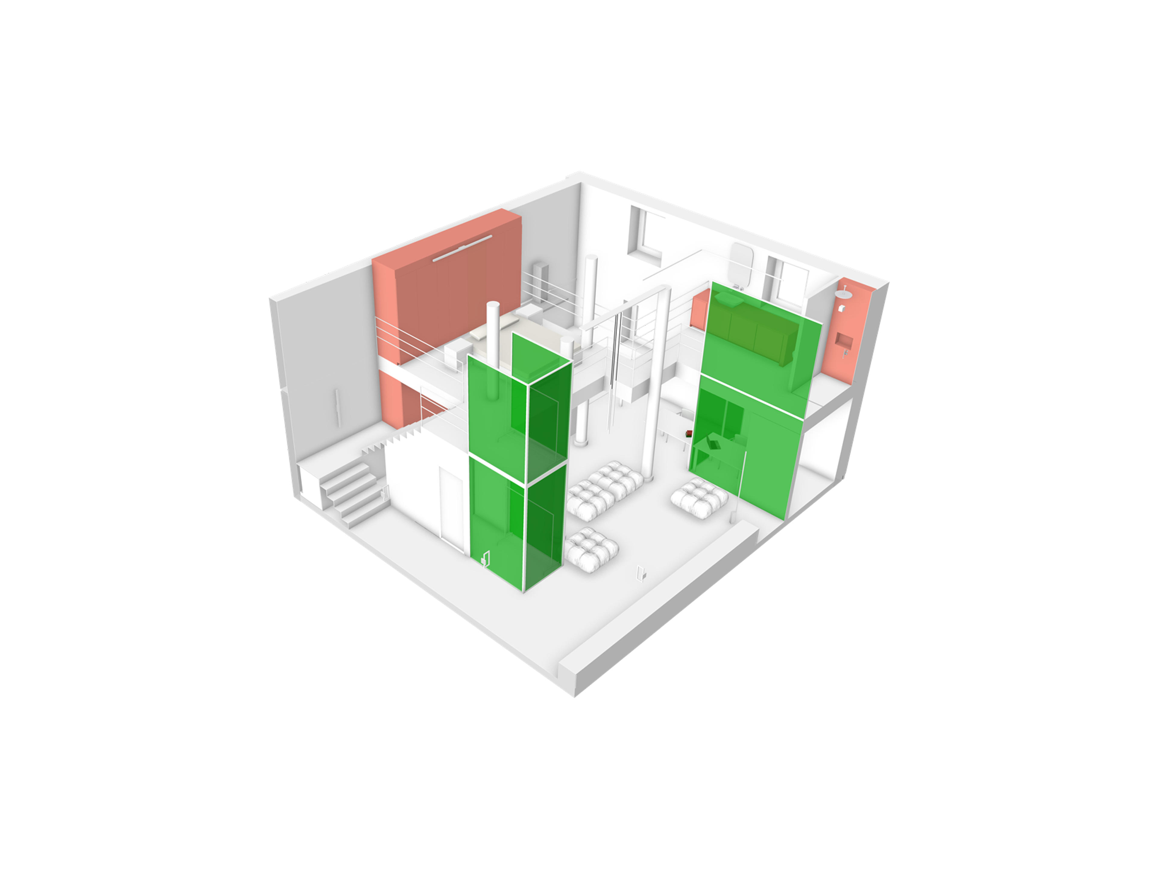 Duik in een wereld van sensualiteit en levendige kleuren met dit interieurontwerp, waar materialen en texturen samensmelten. Mijn keuze voor gekleurd, lichtdoorlatend glas voegt een vleugje mysterie toe, waar enkel contouren zich onthullen en nieuwsgierigheid opwekken bij bewoners en bezoekers. De combinatie van complementaire kleuren zorgt voor een prikkelende ervaring, terwijl de ruimte moeiteloos en logisch blijft, met als middelpunt de groene volumes. Laat je zintuigen verwennen en ontdek de harmonie van kleur en design in deze ruimte.